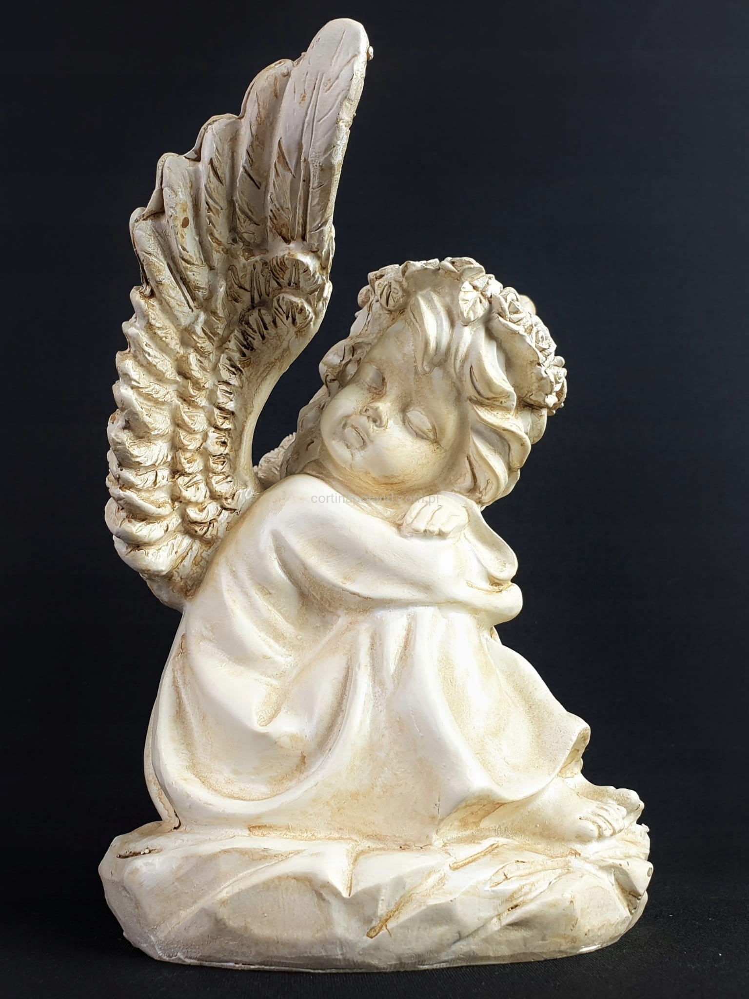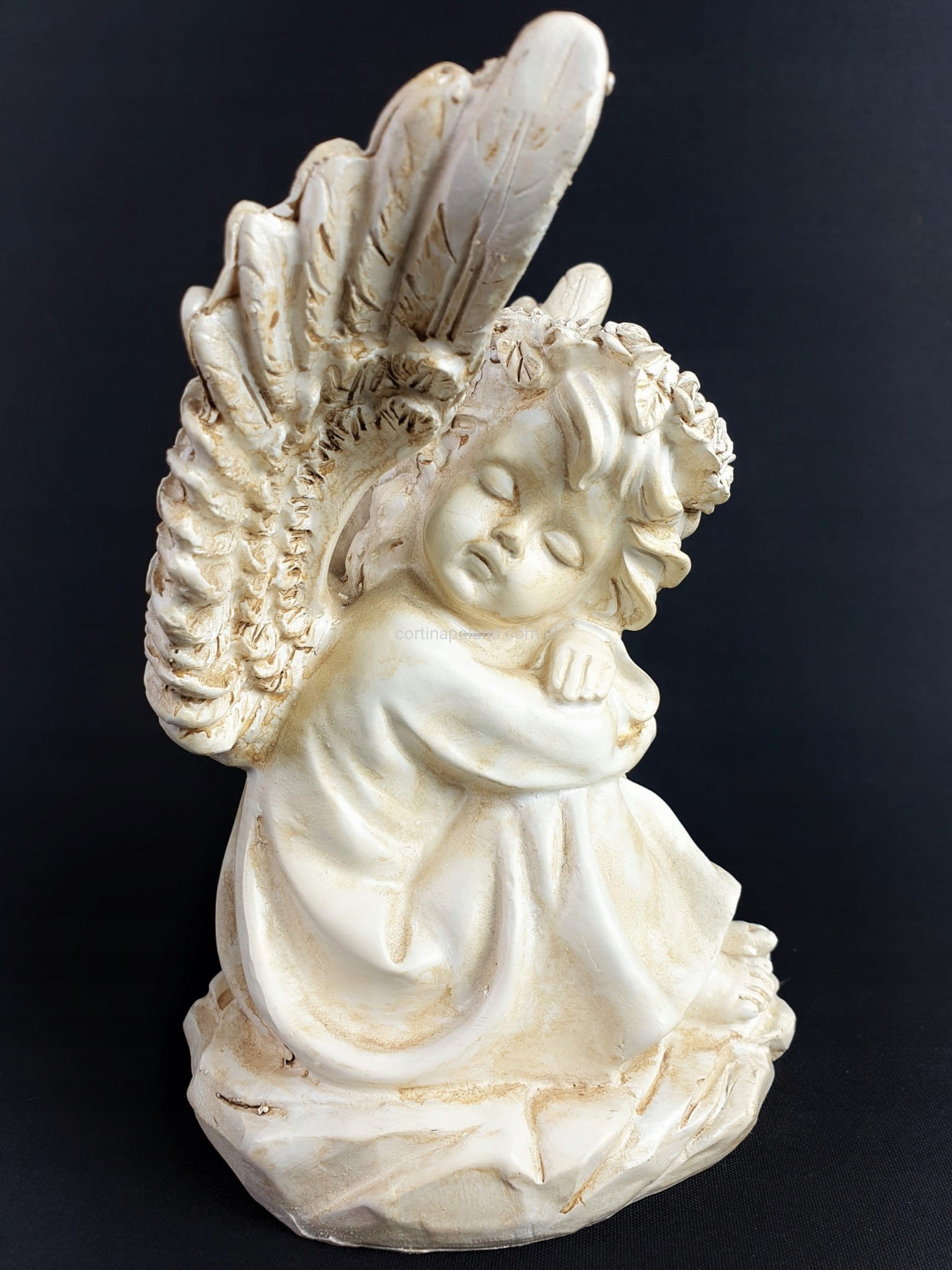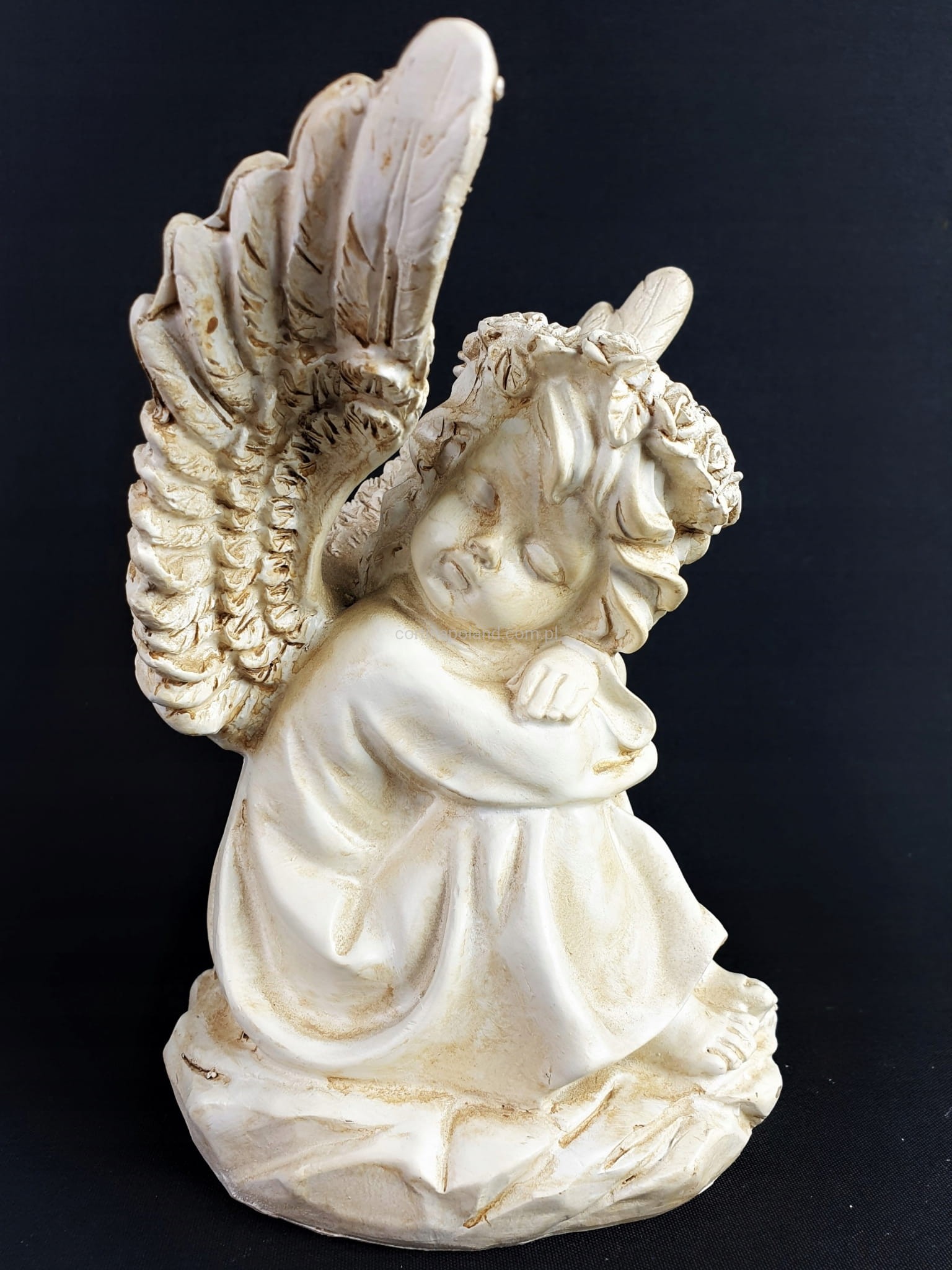 Aniołek wykonany jest z albarium oraz materiału żywicznego, który został poddany impregnacji, dzięki temu zabiegowi może on stanowić idealną dekorację zarówno do wnętrza jak i na zewnątrz np. groby, ogrody, balkony.