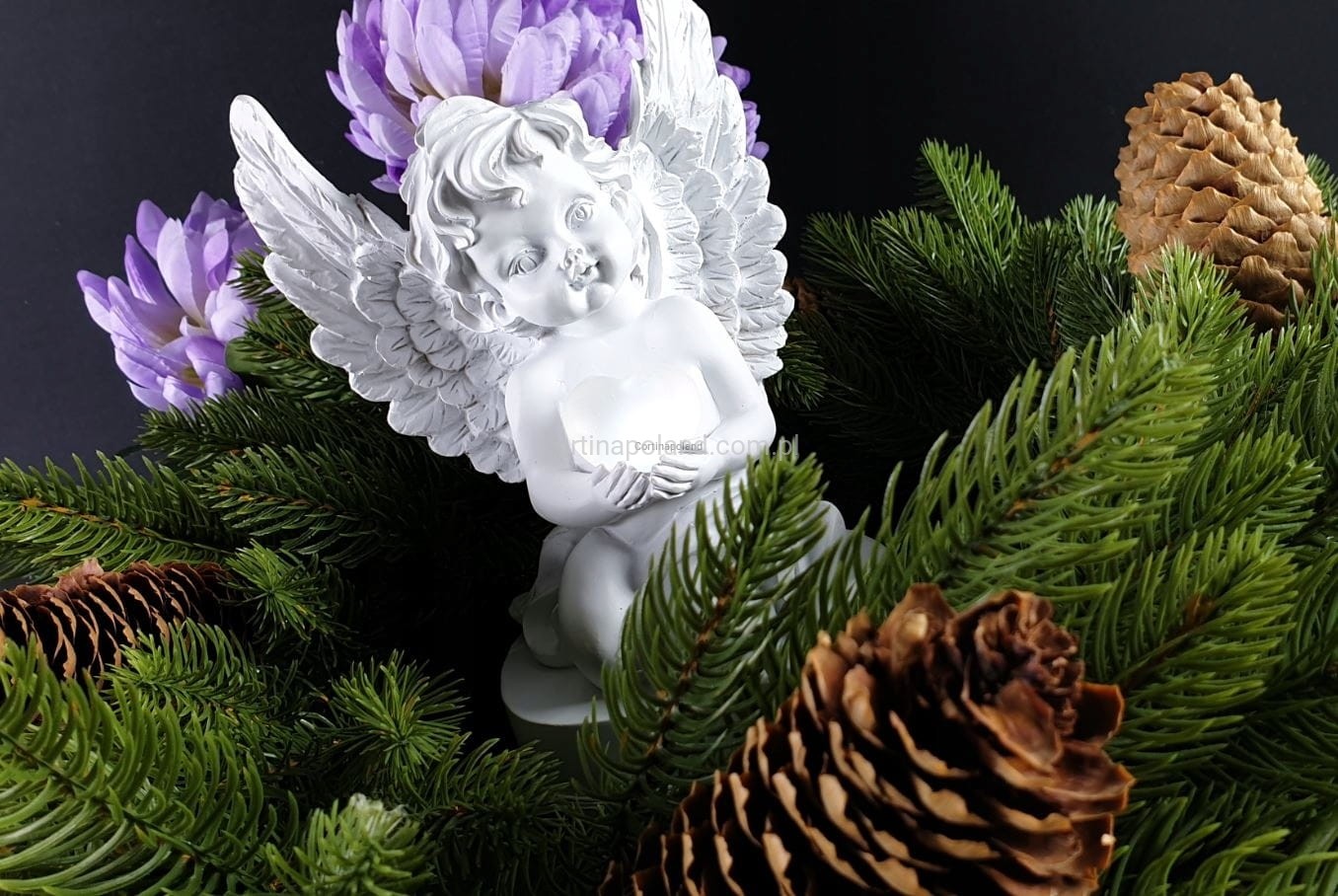 Aniołek wykonany jest z albarium oraz materiału żywicznego, który został poddany impregnacji, dzięki temu zabiegowi może on stanowić idealną dekorację zarówno do wnętrza jak i na zewnątrz np. groby, ogrody, balkony.