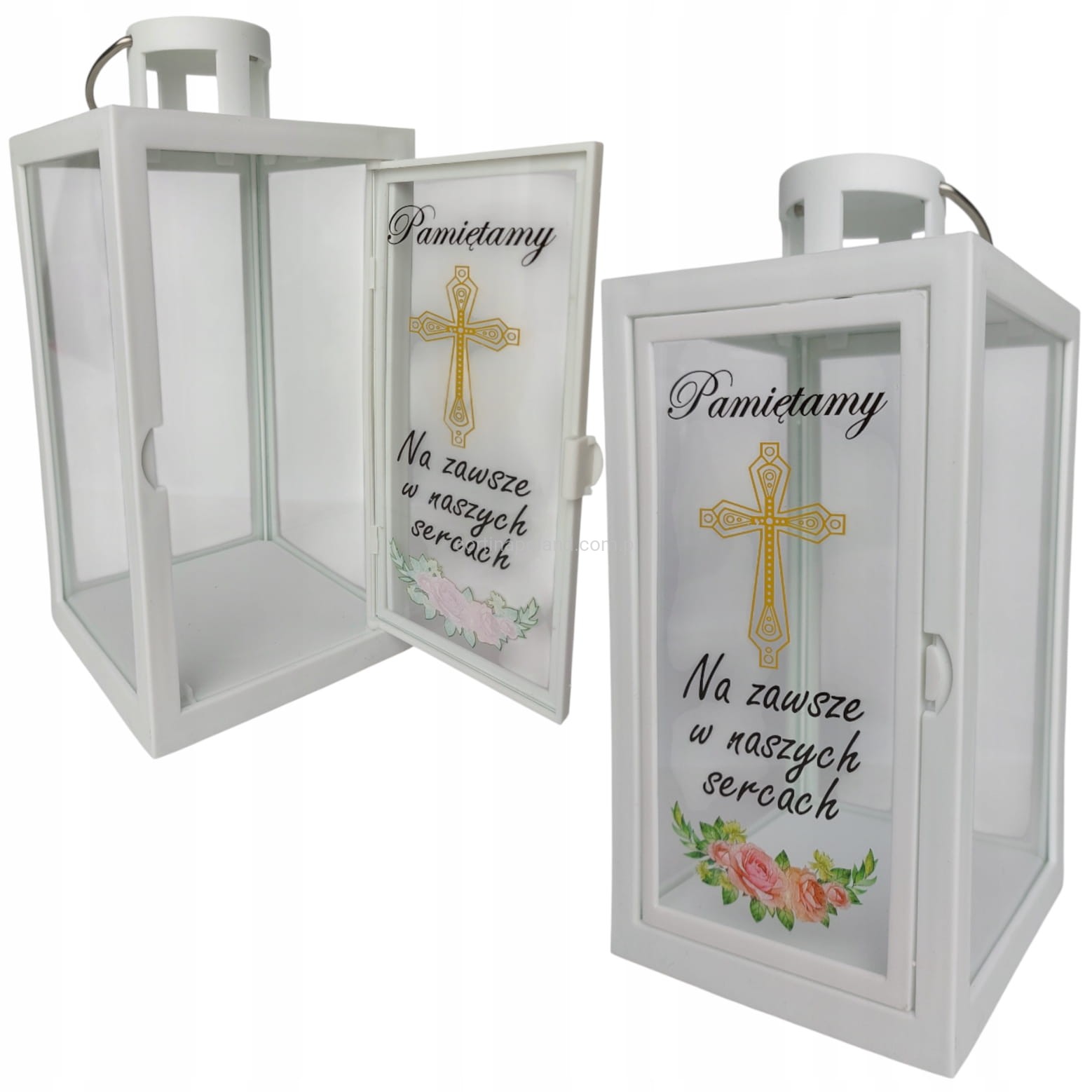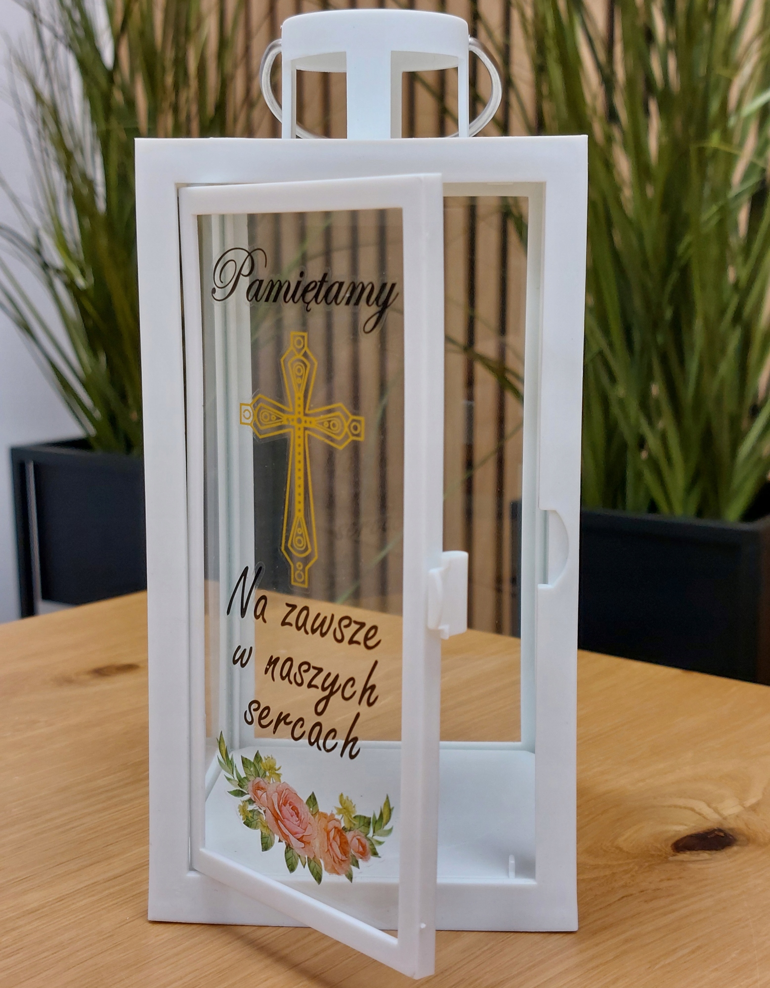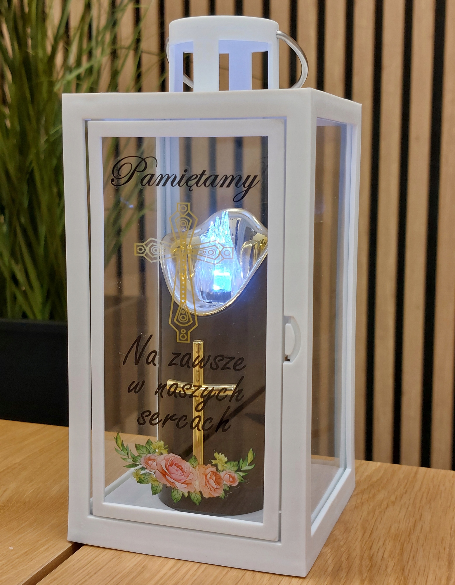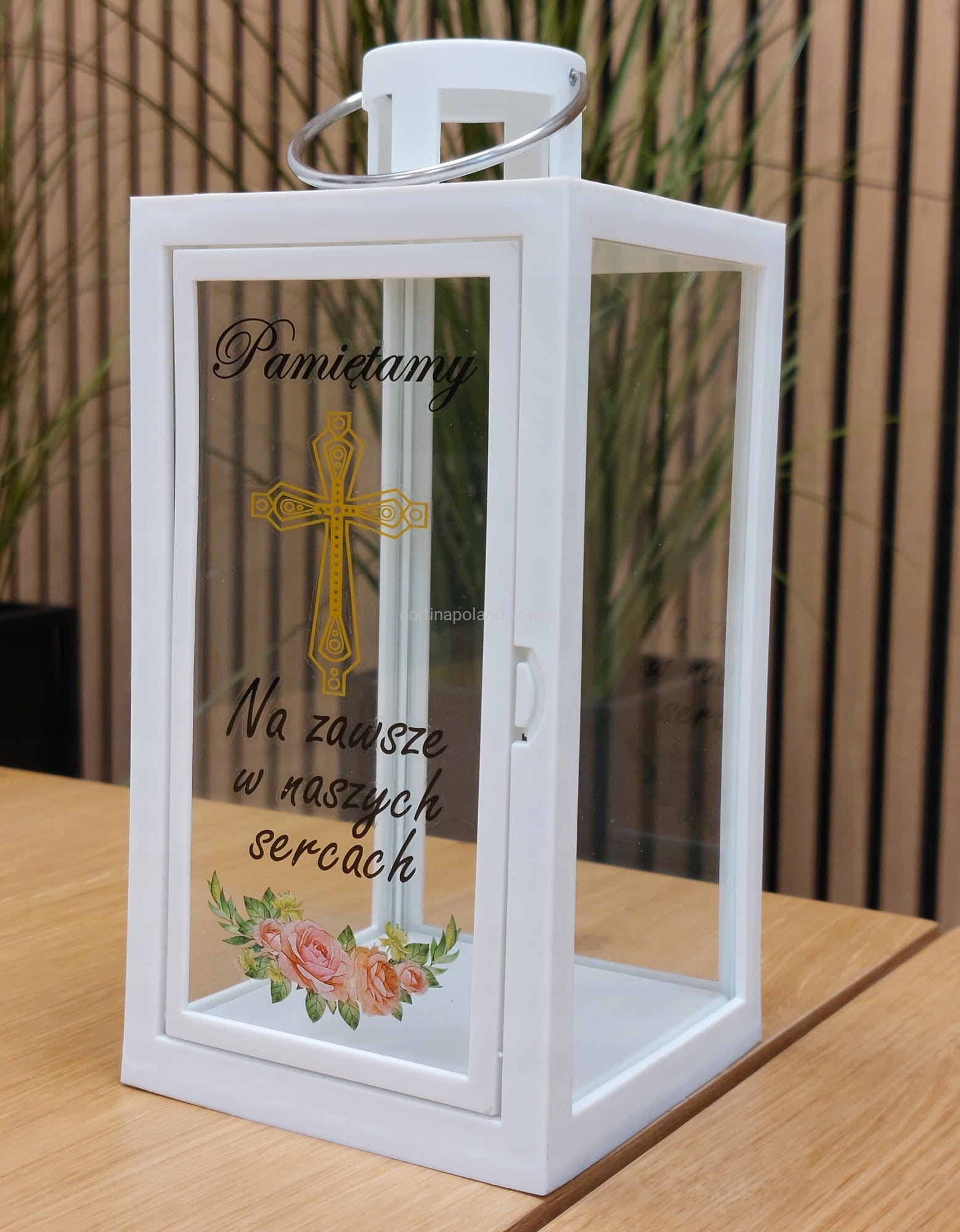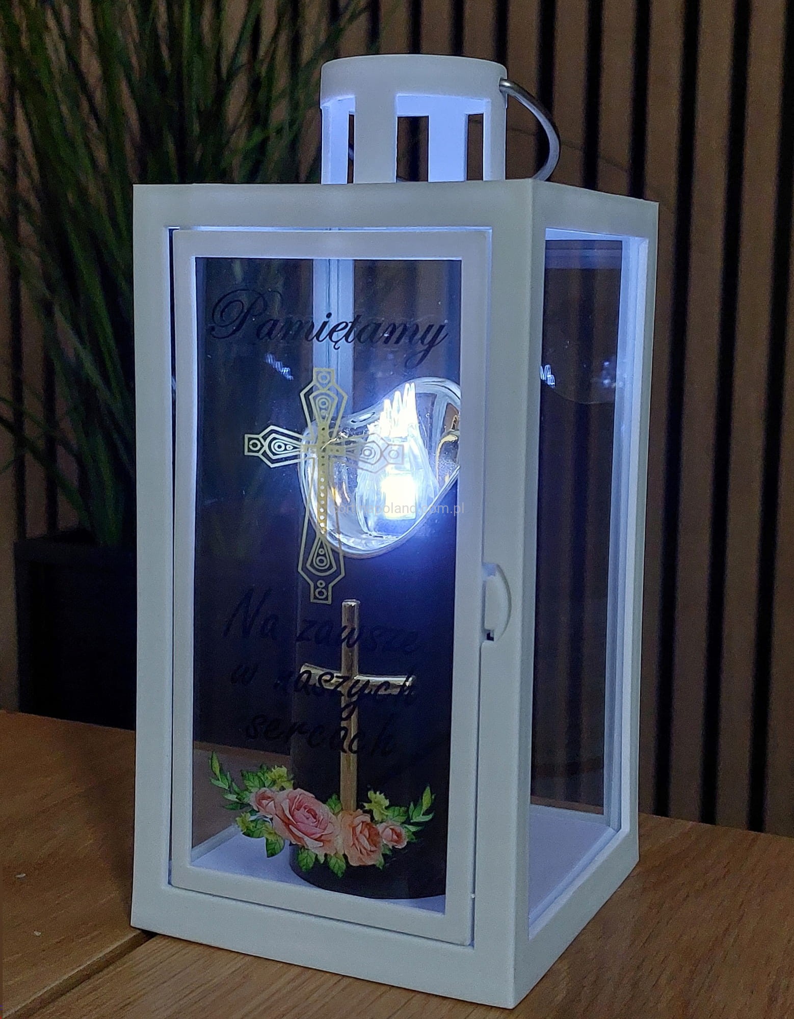 BIAŁA LATARENKA DEKORACYJNA Z NAPISEM " PAMIĘTAMY" - 21 CM